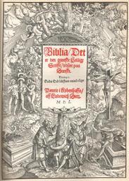 | Keywords: Bible of Christian III 1550.jpg Cover of Christian III s Bible the first complete translation of the Bible to Danish <p>A large tree divides the image between events from the Old Testament and the New Testament On the left side Old Testament you can see Moses on Mount Sinai receiving the tablets of testimony from God Also visible is the Fall of man and a coffin as a symbol of death The leaves of the tree are dry while on the right side New Testament the leaves are fresh symbolizing the work of Christ Also on the right side is the crucifixion At the foot of the cross is John the Baptist and a Jewish rabbi pointing at Christ indicating that Christ will save all sinners </p><p>Notice also that Moses is depicted with horns in his forehead This comes from a misinterpretation of Exodus 34 verse 35 'the skin of Moses' face shone' while he talked with God This sentence was for many centuries mistranslated to 'Moses had horns on his forehead' Hence Altdorfer has depicted Moses with horns </p> John Danstrup Danmarks historia Från äldsta tid till våra dagar Första bandet Malmö Allhems förlag 1946 Published in 1550 Cover designed by Erhard Altdorfer wood carving PD-old-100 Bible of Christian III Title pages from Denmark 16th-century woodcuts of people Title pages in Danish Law and Grace |