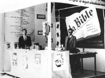 | Keywords: algeria bible missionary fair larence stedford larencestedford irvin hoffman irvinhoffman robert stetter robertstetter mennonite board of missions mennoniteboardofmissions blackandwhite monochrome black and white Caption: 1962. Lawrence Stedford, British & Foreign Bible Society Director for North Africa and Irving Hoffman, missionary with North African Mission, and Robert Stetter supervised this Bible stand at Colomb-Bechar fair for nearly three weeks. Bibles in Russian, Hungarian, Ararbic, Hebrew and French were available. Citation: Mennonite Board of Missions. Photographs. Algeria Pax, 1955-1963. IV-10-7.2 Box 1 folder 27, photo #54. Mennonite Church USA Archives - Goshen. Goshen, Indiana. Caption: 1962. Lawrence Stedford, British & Foreign Bible Society Director for North Africa and Irving Hoffman, missionary with North African Mission, and Robert Stetter supervised this Bible stand at Colomb-Bechar fair for nearly three weeks. Bibles in Russian, Hungarian, Ararbic, Hebrew and French were available. Citation: Mennonite Board of Missions. Photographs. Algeria Pax, 1955-1963. IV-10-7.2 Box 1 folder 27, photo #54. Mennonite Church USA Archives - Goshen. Goshen, Indiana. |