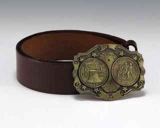 | Keywords: Bicentennial Belt.jpg en Black leather belt with a brass commemorative Bicentennial belt buckle with USA / 200 printed in script along with images of the Liberty Bell and the Spirit of ™76 brass 3 H x 40 5 W Institution Gerald R Ford Presidential Museum http //www fordlibrarymuseum gov/museum/ArtifactCollectionSamples/Catagories/Bicentennial/Belt html Belt accession number 1988 916 2 credit line Courtesy of the Gerald R Ford Presidential Museum Donation Date 1976 Institution Institution Gerald R Ford Presidential Museum Gerald R Ford Presidential Library and Museum-cooperation PD-USGov Liberty Bell Belt buckles United States Bicentennial materials in the Gerald R Ford Presidential Museum Uploaded with UploadWizard |