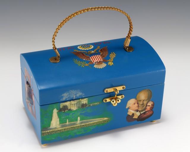 Keywords: Bicentennial Box.jpg en This handmade Bicentennial wooden box is painted blue and decorated with patriotic images including the seal of the President and images of George Washington and Thomas Jefferson Red suede lines the inside and the inside cover is inscribed Mayor and Mrs Lawrence F Kramer “ June 6 1976 <br> Note The mayor presented this commemorative box to President Gerald R Ford during the president ™s trip to New Jersey wood 5 H x 9 W x 5 D Institution Gerald R Ford Presidential Museum http //www fordlibrarymuseum gov/museum/ArtifactCollectionSamples/Catagories/Bicentennial/Box html Box with handle accession number 1988 208 credit line Courtesy of the Gerald R Ford Presidential Museum Donation Date June 6 1976 Institution Institution Gerald R Ford Presidential Museum Gerald R Ford Presidential Library and Museum-cooperation PD-USGov Uploaded with UploadWizard United States Bicentennial materials in the Gerald R Ford Presidential Museum United States Bicentennial Wooden boxes |
