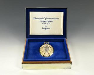 | Keywords: Bicentennial Pocket Watch.jpg en Silver pocket watch has the Seal of the President depicted on the front set with colored stones The watch face features a silver background with gold details The pocket watch sits inside a silver box lined with blue velvet Gift of Betty Ford Institution Gerald R Ford Presidential Museum http //www fordlibrarymuseum gov/museum/ArtifactCollectionSamples/Catagories/Bicentennial/Watch html Pocket Watch accession number 2007 179 3 credit line Courtesy of the Gerald R Ford Presidential Museum Donation Date July 10 2007 Institution Institution Gerald R Ford Presidential Museum Gerald R Ford Presidential Library and Museum-cooperation PD-USGov Uploaded with UploadWizard United States Bicentennial materials in the Gerald R Ford Presidential Museum United States Bicentennial Pocket watches Longines |