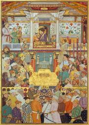 | Keywords: Bichitr - Padshahnama plate 10 - Shah-Jahan receives his three eldest sons and Asaf Khan during his accession ... - Google Art Project.jpg fl 1615 1615 fl 1660 1660 558014 Bichitr Indian Mughal fl 1615 - fl 1660 /collection/the-royal-collection-london/artwork/padshahnama-plate-10-shah-jahan-receives-his-three-eldest-sons-and-asaf-khan-during-his-accession-ceremonies-8-march-1628-bichitr/563008/ Bichitr /artist/bichitr/4128405/ 4128405 /collection/the-royal-collection-london/ The Royal Collection London 438176 http //www royalcollection org uk/ 12/20/2011 11 15 28 AM /collection/the-royal-collection-london/artwork/padshahnama-plate-10-shah-jahan-receives-his-three-eldest-sons-and-asaf-khan-during-his-accession-ceremonies-8-march-1628-bichitr/563008/ 1630 1630 Manuscript on paper with gold decorated borders; miniatures in gold and bodycolour Commissioned by Shah-Jahan; by descent; bought by Asafuddawla Nawab of Oudh by 1776; presented via Lord Teignmouth Governor-General of India to George III 1797 586 563008 False 1657 1657 3/24/2012 4 08 11 AM RCIN 1005025 k http //www royalcollection org uk/collection/1005025 Supplied by Royal Collection Trust / c HM Queen Elizabeth II 2012 Books Manuscripts 1630 1660 h586 mm 1630 - 1657 False 0 70703125 Object padshahnama-plate-10-shah-jahan-receives-his-three-eldest-sons-and-asaf-khan-during-his-accession-ceremonies-8-march-1628-bichitr Padshahnama plate 10 Shah-Jahan receives his three eldest sons and Asaf Khan during his accession ceremonies 8 March 1628 p Manuscript on paper with gold decorated borders; miniatures in gold and bodycolour Commissioned by Shah-Jahan; by descent; bought by Asafuddawla Nawab of Oudh by 1776; presented via Lord Teignmouth Governor-General of India to George III 1797 special url_id YwENJuWWE1oH3Q PD-old-100-1923 1660 Google Art Project works by Bichitr Bichitr Manuscripts in the Royal Collection of the United Kingdom Shah Jahan I |