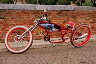 Keywords: bicycle strangeness eccentric wheels pedals elongated ray saddle wall bricks bridge handlebars