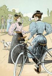 | Keywords: Bicycling; The Ladies of the Wheel, 1896.jpg Artwork The woman holding the bicycle is wearing a short dress over dark leggings Her dress retains the style of the epoque with a sharply accentuated corseted waist a very high collar and billowing leg of mutton sleeves The woman on the left wears an English tailored suit Her skirt is narrow through the hips and widens through the hem Her blouse has fairly wide sleeves and a very high collar Both women's hats are perched on top of their heads most likely held down by hat pins Abstract sources Boucher François 20 000 Years of Fashion New York Harry N Abrams Inc 1967 Ruppert Jacques Le Costume Français Paris Flammarion 1996 1898 colored plate 10 x 15 cm Institution Brown University Library object history exhibition history credit line accession number 1-SIZE GT887 U8 1898 1150468773590652 PD-old-100 Images of Paris from the Brown University Library People with bicycles in Paris Fashion in 1896 1896 in Paris Females with bicycles Les modes de Paris 099 Bicycle dresses |