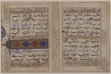 | Keywords: Bihari script.jpg en This folio contains on the right side verses 2-8 of Surat al-Kahf The Cave and on the left side verses 67-70 of Chapter 17 of the Qur'an entitled Surat Bani Isra'il The Children of Israel also known as Surat al-Isra' The Night Journey The borders of the text include a commentary in Persian on a particular verse of the Qur'an The fragment is written in a script known as bihari a variant of naskh cursive typical of northern India after Timur's conquest and prior to the establishment of the Mughal Dynasty ca 1400-1525 A D Bihari script is reconizable by its emphasis on the sublinear elements of the Arabic letter forms thickened at their centers and chiseled like swords at their ends James 1992b 102 The term bihari derives from the province Bihar in eastern India but it seems like its alternative spelling bahari describes the size bahar of the paper used for writing Qur'ans http //memory loc gov/service/amed/ascs/070/0001 jpg Library of Congress Calligrapher unknown circa 1400 1525 AD PD-Art Arabic calligraphy styles Qur'an manuscripts 16th century Library of Congress Arabic Persian and Ottoman calligraphy collection |