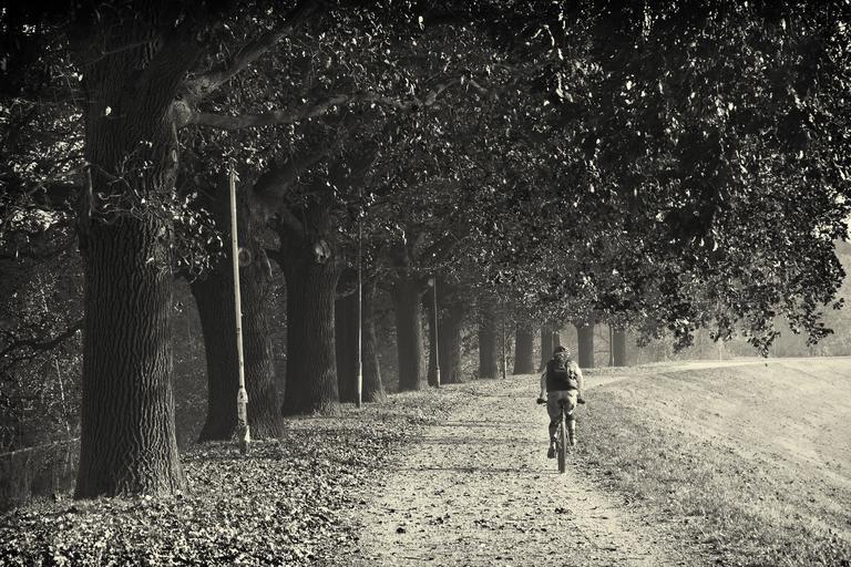 Keywords: bike bicycle cyclist biker exercise fitness trial path grass trees black and white