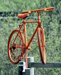 Keywords: bike bicycle orange fence-post foliage greenery painted display wheels color