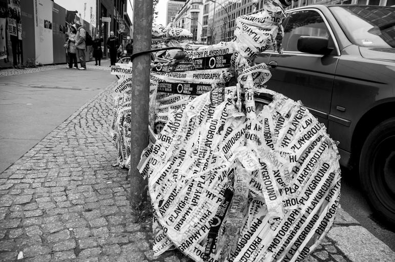 MAKE A MEME View Large Image bike bicycle wheel outdoor city urban photography tape taped up black white b w pavement sidewalk lamp post streetlight car cobbles curb kerb