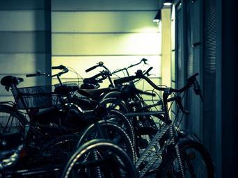 Keywords: bike racks bicycles night parking possibility bike turn off silver side by side bicycle stand chrome lined up steel