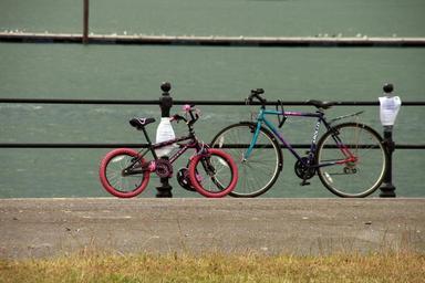 Keywords: bike railings ocean pink green bicycle cycle travel cycling happy outdoor leisure trip wheel recreation natural