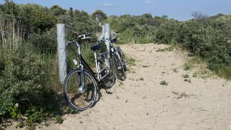 Keywords: bike wheel sand holland north sea zandvoort beach coast dunes sky silent nature landscape relaxation relax holiday travel coastal landscape dutch idyll rest