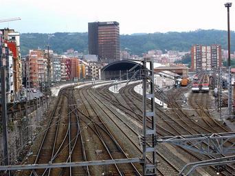 Keywords: bilbao spain railroad railway mass transit transportation station depot railway station track tracks sky clouds trees buildings urban outside