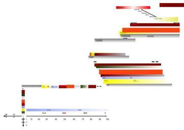 | Keywords: Bild mental numbers.tif de Mentale Zahlenvorstellung Dieses Zahlensystem befindet sich im dreidimensionalen Raum und legt sich wie eine transparente Vorstellung über die Realität die ich gerade sehe Man kann es sich so vorstellen In Comics werden Gedanken von Protagonisten in einer Gedanken-Sprechblase dargestellt Das Zahlensystem würde sich in einer solchen Sprechblase befinden Diese ist transparent und legt sich direkt über die Realität Aber es ist klar dass der Inhalt der Gedanken-Sprechblase nicht die Realität ist denn sie breitet sich von meinem Kopf aus in die Realität aus und ist auch niemals so klar wie die Realität Wenn ich an die Zahl 1'000'000 denke dann muss ich nach rechts und sehr weit in die Ferne schauen Die Zahl sehe ich dann ungefähr da wo sich in der Realität z B in einer Stadt das oberste Stockwerk eines Hochhaus befinden könnte Wenn ich an die Unendlichkeit denke muss ich bis zum Horizont schauen Die Unendlichkeit ist ein bisschen weiter oben und ein bisschen weiter rechts im Himmel Wenn ich eine einzelne bestimmte Zahl wie z B 256'985 in schwarzer Druckschrift auf Papier sehe dann befindet die sich logischerweise in der Mitte des Blickfeldes und sieht schwarz aus Irgendwie sehe ich sie dann am selben Ort auch in gelbe Farbe getaucht mit einem Schuss orange bei der Ziffer žfünf und einem weiteren Farbwirrwarr bei den nachfolgenden Ziffern Insgesamt ist die Zahl aber gelb Es ist so als würde man mit einer farbigen Taschenlampe auf das Papier leuchten Meine Augen sehen dann zum einen die schwarze Zahl 256'985 aber gleichzeitig sind die Augen auch eine Art Taschenlampe welche den Zahlen die farbigen Schatten verleiht Gleichzeitig ist diese Zahl in der Gedanken-Sprechblase wie mit einem Faden an der Position der 200'000er-Reihe befestigt Das heisst ich schaue automatisch nach rechts und recht weit in die Ferne um die Zahl einzuordnen Wobei das gesamte Zahlensystem nur minimal wie ein nicht farbiger Schatten auftaucht der die Gedanken-Sprechblase formt Lediglich der 200'000-Block tritt eventuell zusätzlich noch in gelber Farbe in den Vordergrund Es ist nie so dass ich das gesamte Zahlensystem auf einen Blick farbig sehen würde Es sind in der Gedanken-Sprechblase nur grobe graubläuliche plastische und in Nebel eingehüllte Strukturen zu erkennen Farbig und klar wird ein Teil des Zahlensystems erst wenn ich auf eine bestimmte Zahl schaue Einzelne Zahlen z B 95 und 99 unterscheiden sich natürlich auch anhand der Farbgebung Das 95 ist hauptsächlich schwarz aber danach kommt noch orange Die 99 ist hingegen ganz schwarz Und ein wenig grösser und natürlich anders positioniert als die Zahl 0 00099 Zwischen 1000 und einer Million sind die Positionen nicht so stabil Die 1000 die Million und die Unendlichkeit haben aber eine fixe Position und von der Million geht es in einer ganz klaren Richtung auf einer Ebene nach hinten aufwärts und nach links weiter Wie bereits erwähnt sehe ich nie das gesamte Zahlensystem in Farben Wenn ich das gesamte System im Blickfeld habe sieht es eher aus als wären die Farben durch graublau-violettem Nebel verdeckt und es sind nur die Eckpunkte 10 100 1000 10'000 100'000 1'000'000 zu erkennen Dabei sind die 10 100 1000 10'000 und 100'000 gräulich und wie mit Bleistift geschrieben Wenn ich aber z B an eine 40'000 denke dann tritt diese automatisch hervor Diese überschreibt dann fast die 10'000 aber sie hat dieselbe Farbe wie z B der 400er-Block Die 10'000 bleibt dabei aber erkennbar da die 40'000 ein bisschen weiter rechts ist Von der 400'000 unterscheidet sich die 40'000 durch die Länge des Blocks die ungefähre Position und durch die genaue Farbtönung die Blöcke 100'000 bis 900'000 sind klarer glänzender und leuchtender als die leicht graustichigen Blöcke von 10'000 bis 90'000 Der Block von 100 bis 999 ist klarer positioniert Allerdings verschwimmen die 100er-Blöcke trotzdem ganz ein wenig ineinander und sind nicht immer farbig Erst wenn ich z B konkret an die 500 denke dann kommt diese Linie in knalloranger Farbe in den Vordergrund Ein wenig sehe ich dann auch als Schatten die anderen 100er-Linien in Farbe Von der 1000 über die 10'000 und über die 100'000 bis zur Million kommt man durch das Betätigen der žTabulator-Taste wie in einem Schreibprogramm Genauso kommt man mit der Tabulator-Taste auch wieder von der Million auf die 1000 herunter Da die 10'000 und die 100'000 nahe beieinander liegen und recht unklar positioniert sind kann es vorkommen dass dabei mal die 10'000 oder die 100'000 ausgelassen wird z B dass man mit zwei Tastendrücken schon von der Million zur 1000 kommt Die Tabulatortaste wird benutzt um z B 1'000'000 durch 100 zu teilen Da sehe ich die Million und die 100 an ihren Orten platziert Da die 100 zwei Nullen hat muss ich von der Million aus zweimal die Retour-Tabulator-Taste betätigen Dabei erscheint mir beim ersten žTastendruck die 100'000 dann nach dem zweiten žTastendruck die 10'000 Der waagrechte Zahlenstrahl wird je nach Aufgabenstellung passend skaliert Der senkrechte Zahlenstrahl nach unten wird benutzt um Rechnung wie ž5-7 zu lösen Da die Abstände genauso gross sind wie zwischen den Zahlen 0 bis 10 kann neben die Zahlen 0 bis 5 ein tannengrüner Siebner-Stab gelegt werden der bis zur -2 geht Dabei wird der orange Fünfer-Stab der auf der Zahlenlinie von 0 “ 5 liegt mit dem Siebner-Stab verglichen und man sieht auf einen Blick dass der tannengrüne Siebner-Stab um zwei Einheiten weiter nach unten geht als der orange Fünfer-Stab So kann das Resultat abgelesen werden Rechnungen wie ž40-60 werden hingegen anhand des waagrechten Zahlenstrahls gelöst Auch hier wird ein 40er-Stab mit einem 60er-Stab verglichen der bis -20 ins Minus zieht Für Dezimalstellen kann ich auch einen entsprechend skalierten Zahlenstrahl verwenden Natürlich ist in einem solchen Fall nur noch ein sehr kleiner Ausschnitt des gesamten Zahlensystems im Blickfeld own Rosanick 2012-01-20 Cc-zero Synesthesi