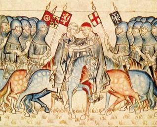 | Keywords: Bilderzyklus des Codex Balduini.jpg Kurfürst Balduin von Trier Wappen rotes Kreuz auf weißem Grund begegnet seinem Neffen Johann dem König von Böhmen Wappen weißer Löwe auf rotem Grund In der Begleitung Johanns erkennt man an seinem Wappen weißes Rad auf rotem Grund den Erzbischof von Mainz Aus dem Bilderzyklus des Codex Balduini Trevirensis Landeshauptarchiv Koblenz http //www politische-bildung-rlp de/fileadmin/download/d52001 pdf PDF PD-old PD-Art Balduin von Luxemburg John I Count of Luxemburg Prince-electors Wheel of Mainz in heraldry User Kandschwar Codex Balduini Trevirensis Medieval miniatures of horses |