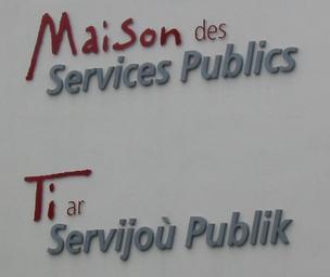 Keywords: Bilingual public services sign Carhaix.jpg Bilingual sign of public services building in Carhaix Brittany Own 2007-08-16 Man vyi Carhaix-Plouguer Bilingual Breton-French signs