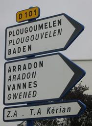 Keywords: Bilingual traffic sign Le Bono Vannes.jpg Bilingual signage Le Bono Brittany Own 2007-08-23 Man vyi Bilingual Breton-French road signs Le Bono 101 number Road signs in Morbihan