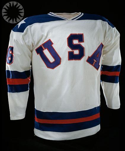 Cultural History artifacts for the SITES show "Sports: Breaking Records, Breaking Barriers" Olympic Hockey Team, uniform jersey (1980), uniform worn by player in the gold medal game against Russia.