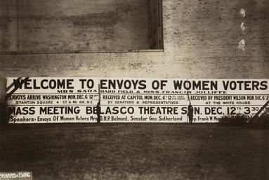 | Keywords: Billboard signs welcoming suffrage envoys 159033v.jpg Summary Photograph of billboard signs on brick wall welcoming arrival of Congressional Union automobile envoys in Washington D C Welcome to envoys of women voters Mrs Sara Bard Field Miss Francis Jolliffe Envoys arrive Washington Mon Dec 6th 12 noon Stanton Square 4th St MD Ave N E Received at Capitol Mon Dec 6th 12 30 P M East Steps by Senators Representatives Received by President Wilson Mon Dec 6th 2 P M at the White House Mass Meeting Belasco Theatre Sun Dec 12th 3 30 P M Speakers Envoys of Women Voters Mrs O H P Belmont Senator Geo Sutherland Rep Frank W last name obscured 1 photograph print 5 x 7 in accession number Call Number Location National Woman's Party Records Group I Container I 159 Folder Envoys from San Francisco Source Collection Records of the National Woman's Party institution Library of Congress Manuscript Division http //hdl loc gov/loc mss/mnwp 159033 PD-1923 PD-Harris-Ewing suffragettes Billboards in Washington D C December 1915 in Washington D C |