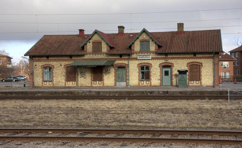 Keywords: billesholms train station sweden railway brick building rails tracks railroad