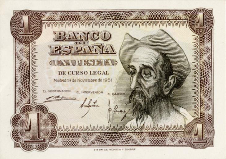 | Keywords: Billete de 1 peseta del Banco de España, 1951 (Anverso).jpg es Billete de 1 peseta Anverso Banco de España Madrid 19 de noviembre de 1951 Luis Gasca Collection http //www cervantesvirtual com/bib_autor/cervantes/graf/fotos/65_s jpg Fábrica Nacional de Moneda y Timbre 1951-11-19 PD-old Banknotes of Spain Don Quixote in art Peseta banknotes 1951 Spain in the 1950s Banknotes with a face value of 1 | ||||