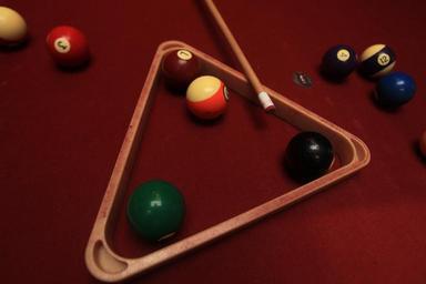 Keywords: billiards pool table rack balls cue stick sport recreation play fun leisure indoors focus competition