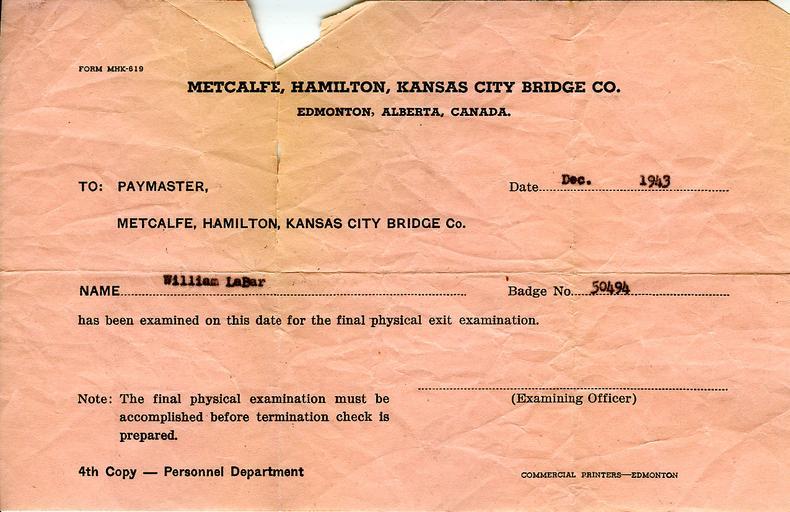 | Keywords: metcalfe, hamilton, kansas city bridge company metcalfehamiltonkansascitybridgecompany peace river bridge peaceriverbridge alaska highway alaskahighway bridge alcan highway alcanhighway document text Bill changed jobs to work on the Peace River Bridge, evidently for the Metcalfe, Hamilton, Kansas City Bridge Company (MHKCBCo). This form was probably the one he needed before he could return home for the first time in nine months. His final letter to Helen from that period was written before he boarded the train home from Edmonton, Alberta. There was great meaning in what he wrote at the top of that letter: "On the Way, Dec 10, 1943." Bill changed jobs to work on the Peace River Bridge, evidently for the Metcalfe, Hamilton, Kansas City Bridge Company (MHKCBCo). This form was probably the one he needed before he could return home for the first time in nine months. His final letter to Helen from that period was written before he boarded the train home from Edmonton, Alberta. There was great meaning in what he wrote at the top of that letter: "On the Way, Dec 10, 1943." |