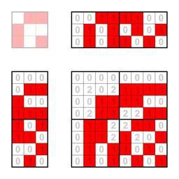 | Keywords: Binary Walsh matrix 8; sequency.svg Binary Walsh matrix in sequency order as a product White 0 and red 1 result with modulo 2 operations Gray numbers result with normal operations The two matrices used as factors which are transposed to each other correspond to the same Walsh permutation wp 6 1 5 0 6 1 7 5 3 4 2 <br> All 6 Walsh permutations whose compression vectors are permutations of 1 5 6 could have been used instead <br> wp 6 1 5 was chosen because it is the only one with a symmetric compression matrix shown in the top left corner <br> It is the square root of wp 4 6 3 which permutes the natural ordered into the sequency ordered Hadamard matrix own mate2code Size 16 100px Walsh matrix of order 8 Walsh matrix; sequency ordered Compression matrices of 3-bit Walsh permutations Matrix multiplication |