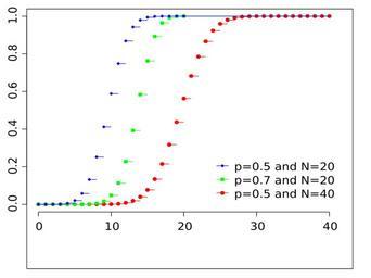 | Keywords: Binomial distribution cdf.svg Binomial distribution cumulative distribution function Own 2008-03-02 Tayste R source code <source lang rsplus > R source code for Wikipedia SVG plot of Binomial CDF by de User Sigbert Feb 2010 require RSvgDevice create binomial cdf <- function N p colour black pch 16 n <- max length N length p length colour length pch N <- rep N length n ; p <- rep p length n colour <- rep colour length n ; pch <- rep pch length n add one series <- function N p colour pch maxN cdf <- pbinom 0 N N p lines 0 N cdf type s col colour for i in 1 N lines c i-1 i c cdfi cdfi type s col colour lines c N maxN c 1 1 type s col colour points 0 N cdf col colour pch pch par lwd 1 5 cex 1 mar c 3 1 2 5 0 5 0 5 plot 1 xlim c 0 max N ylim c 0 1 type n xlab ylab for i in 1 n add one series Ni pi colouri pchi max N text paste p rev p and N rev N sep legend max N 0 legend text xjust 1 yjust 0 pch rev pch lwd rep par lwd 3 col rev colour y intersp 1 5 bty n devSVG Binomial_distribution_cdf svg width 4 height 3 create binomial cdf c 40 20 20 c 0 5 0 7 0 5 c red green blue c 20 15 18 dev off </source> Binomial distributions Images with R source code |