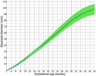 | Keywords: Biparietal diameter by gestational age.svg Biparietal diameter of a fetus by gestational age with the blue line representing the mean and the green area representing the 90 prediction interval Reference Cite journal Snijders RJ Nicolaides KH Fetal biometry at 14-40 weeks' gestation Ultrasound Obstet Gynecol 4 1 34-48 Jan 1994 10 1046/j 1469-0705 1994 04010034 x 12797224 In addition to data taken from this study the diagram is extrapolated from 0 to 14 weeks of gestational age by the rationale that it is 0 by fertilization at 2 weeks of gestational age own Mikael Häggström 2013-09-13 thumb left png-version Obstetric ultrasonography Cc-zero |