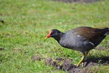 Keywords: bird animal moorhen wildfowl photo photograph feathers wild nature natural green grass red beak coot duck