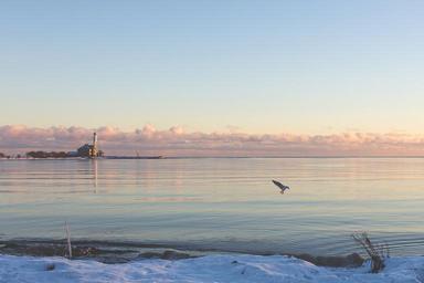 Keywords: bird animal wings flying snow water coast sunset clouds