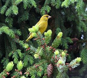 Keywords: bird bill yellow animal nature birds feather small close fir tree branches
