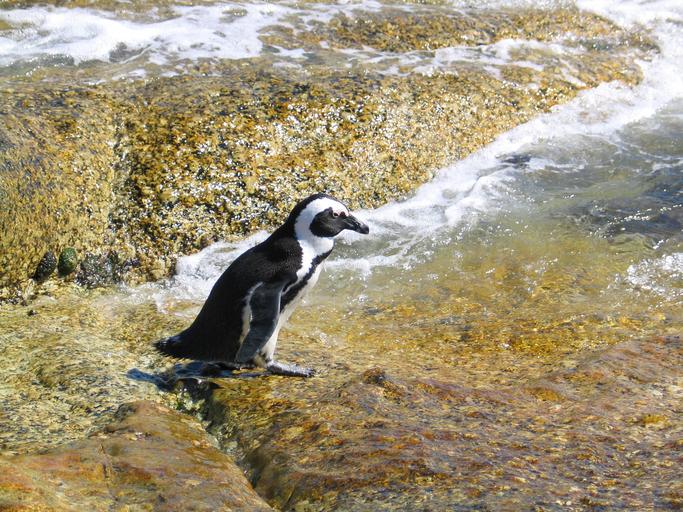 Keywords: bird black and white copy space marine bird ocean penguins rocks sea swim waddle walk walking water