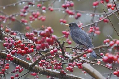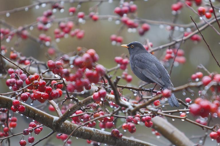 Keywords: bird blackbird autumn red fruits wet black nature animals berries netherlands