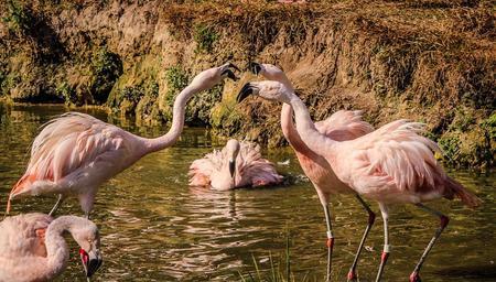 Keywords: bird flamingos squabling altercation wading birds pink feathers fight fly wings feather wildlife beak wild freedom outdoor avian majestic creature wilderness nature mammal vertebrate animal