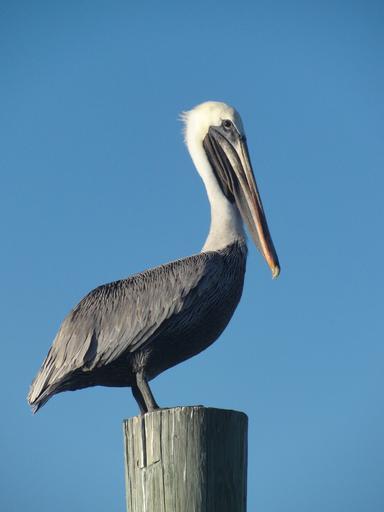 Keywords: bird pelican fence sky beak harbor harbour nature wildlife animal pelecanus wild feather lake wing outdoors blue neck post wood