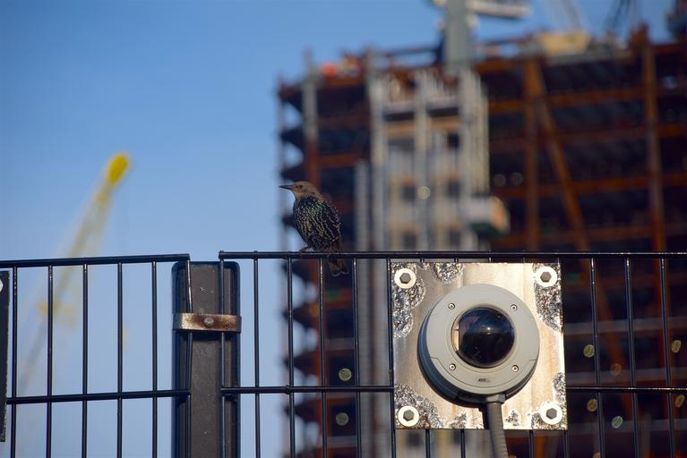 Keywords: bird starling city fence sky feathers animal wildlife beak green outdoor plumage wings fauna