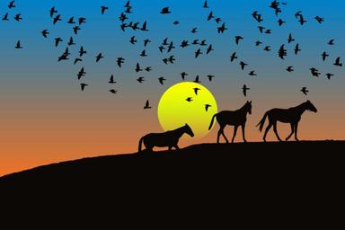 Keywords: birds animals flying horses landscape silhouette sunset colorful