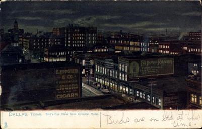 | Keywords: Bird's-eye view from Oriental Hotel, Dallas, Texas.jpg en Bird's-eye view from Oriental Hotel Dallas Texas 1893-1907 The University of Houston Digital Library http //digital lib uh edu The University of Houston Digital Library Custom license marker 2012 03 03 This image is in the public domain and may be used freely If publishing in print electronically or on a website please use the citation Courtesy of Special Collections University of Houston Libraries To order a higher resolution reproduction see http //info lib uh edu/about/campus-libraries-collections/special-collections-archives/request-digital University of Houston Libraries Uploaded with UploadWizard Bird's-eye view postcards Night in Dallas Postcards of Dallas |