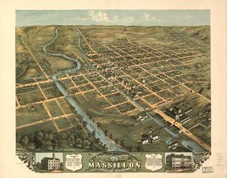 | Keywords: Bird's-eye View of Massillon, Stark County, Ohio, 1870 WDL9584.png Artwork ru Рюге Альбе т 1829-1899 гг fr Ruger Albert 1829-1899 en Ruger Albert 1829-1899 zh 阿尔伯特·鲁格,1829-1899 年 pt Ruger Albert 1829-1899 ar ألبرت روجر ، 1829-1899 es Ruger Albert 1829-1899 ru Вид с высоты птичьего полета на ассиллон ок уг Ста к штат Огайо 1870 г fr Vue aérienne de Massillon dans le comté de Stark dans l'Ohio 1870 en Bird's-eye View of Massillon Stark County Ohio 1870 zh 俄亥俄州斯塔克县马西隆鸟瞰图,1870 年 pt Vista panorâmica de Massillon condado de Stark Ohio 1870 ar لقطة من أعلى لماسيلون، مقاطعة ستارك، أوهايو، 1870 ru а этой пано амной ка те показан г ассиллон штат Огайо в том виде какой он имел в 1870 г Расположенный вдоль восточного бе ега еки Туска авас ассиллон был важным по товым го одом на канале Огайо соединявшем озе о Э и и еку Огайо В пе ечне обозначений в нижней части ка ты указаны п едставляющие инте ес места в том числе школы це кви железнодо ожное депо а также фаб ики заводы чугунолитейный завод и д угие п омышленные соо ужения Пано амная ка та являлась ка тог афической фо мой кото ую ши око использовали для изоб ажения аме иканских и канадских к упных и мелких го одов в конце XIX и в начале XX века Также называемые видами с высоты птичьего полета или пе спективными ка тами эти ка ты п едставляют изоб ажения го одов как будто п и осмот е све ху под ост ым углом Обычно не выче чиваемые в масштабе они показывают асположение улиц отдельные здания и главные особенности пейзажа в пе спективе Эта ка та выполнена Альбе том Рюге ом 1829 1899 гг пе вым аме иканцем достигшим успеха как пано амный художник Родившийся в П уссии Рюге пе еселился в Соединенные Штаты Аме ики и сначала аботал каменщиком П оходя службу в ядах доб овольцев Огайо во в емя Г ажданской войны он исовал виды палаточных лаге ей а мии Союза После войны Рюге поселился в Батл-К ике штат ичиган где начал свою деятельность по составлению пано амных ка т исуя эскизы го одов штата ичиган В конце 1860-х гг Рюге создал това ищество с Дж Дж Стоуне ом из эдисона штат Висконсин и вместе они опубликовали множество го одских пано ам <br>Аэ офотоснимки; Каналы; Го ода и поселки; Пано амные виды; Река Туска авас штат Огайо fr Cette carte panoramique de Massillon dans l'Ohio montre la ville telle qu'elle était en 1870 Située le long de la rive orientale de la rivière Tuscarawas Massillon était une ville portuaire importante sur le canal Ohio qui reliait le lac Érié à la rivière Ohio Les index au bas de la carte indiquent les points d'intérêt notamment les écoles les églises la gare ferroviaire ainsi que les moulins les usines les aciéries et autres établissements industriels La carte panoramique était un type de carte communément utilisé pour représenter des villes américaines et canadiennes vers la fin du XIX<sup>e</sup> et le début du XX<sup>e</sup> siècle Également connues sous le nom de vues aériennes ou cartes de vue en perspective ces cartes représentent les villes vues d'en haut et en oblique Pas toujours dessinées à l'échelle les cartes révèlent le tracé des rues les bâtiments individuels ainsi que les caractéristiques essentielles du paysage en perspective Cette carte est l œuvre d'Albert Ruger 1829-1899 le premier artiste panoramique américain à connaître le succès Né en Prusse Ruger immigra aux États-Unis et commença à travailler en tant que maçon Alors qu'il servait au sein des Volontaires de l'Ohio pendant la guerre de Sécession il dessina des panoramas des camps de l'Union Après la guerre Ruger s'installa à Battle Creek au Michigan où il entama sa carrière de dessinateur de cartes panoramiques en faisant des esquisses des villes du Michigan Vers la fin des années 1860 Ruger s'associa avec J J Stoner de Madison au Wisconsin et publia avec lui de nombreux panoramas urbains <br>Vues aériennes; Canaux; Petites et grandes villes; Vues panoramiques; Rivière Tuscarawas Ohio en This panoramic map shows Massillon Ohio as it appeared in 1870 Located along the east bank of the Tuscarawas River Massillon was an important port town on the Ohio Canal linking Lake Erie and the Ohio River The indices at the bottom of the map indicate points of interest including schools churches the railroad depot and mills factories iron works and other industrial installations The panoramic map was a cartographic form popularly used to depict U S and Canadian cities and towns in the late 19th and early 20th centuries Also known as bird's-eye views or perspective maps these maps are representations of cities portrayed as 
