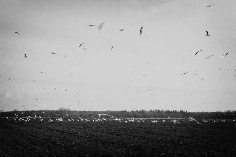 Keywords: birds flying fields rural countryside black and white