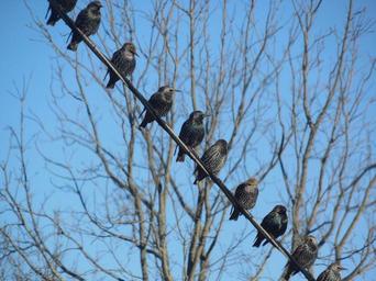 Keywords: birds starlings wild blue plumage animal tail wings feathers beak black wire row wildlife