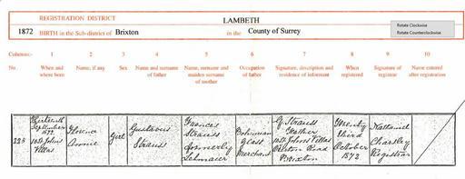 | Keywords: Birth certificate of Florence Annie Strauss.PNG en Birth certificate of Florence Annie Strauss 10 St John's Villas Brixton Lambeth London 1872-09-13 i Ancestry com and ii the General Register Office Southport Merseyside England n/a other versions Custom license marker 2015 11 29 DrSchaub Uploaded with UploadWizard Uncategorized 2015 November 29 |