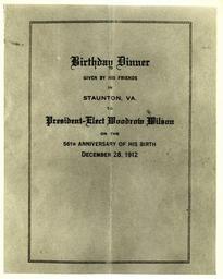 | Keywords: president wilson staunton virginia 1912 monochrome Local Accession Number: 2177 Description: Photograph of a birthday dinner menu for President-elect Wilson. Photographer: Unknown Source: Unknown Size: 8x10 Medium: Print, Black and White Date: 12-28-1912 Local Accession Number: 2177 Description: Photograph of a birthday dinner menu for President-elect Wilson. Photographer: Unknown Source: Unknown Size: 8x10 Medium: Print, Black and White Date: 12-28-1912 | ||||