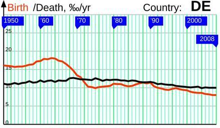 | Keywords: BirthDeath 1950 DE.svg en The birth and death rates in Germany 1950 2008 ru Π ΠΎΠΆΠ΄Π°Π΅ΠΌΠΎΡΡΡ ΠΈ ΡΠΌΠ΅Ρ ΡΠ½ΠΎΡΡΡ Π² ΠΠ΅Ρ ΠΌΠ°Π½ΠΈΠΈ 1950 2008 own Incnis Mrsi 2009-07-14 public domain File Bevoelkerungsentwicklung deutschland png Stefan_Silies data from Statistisches Bundesamt <br> File RNI 1950 DE svg Disclaimer The author of this graph gives no warranty and accepts no responsibility for its factual accuracy This graph is nothing but a visualization of data from http //demoscope ru/weekly/ias/ias05 php tim 0 cou 9 terr 1 ind 26 Submit OK http //demoscope ru/weekly/ias/ias05 php tim 0 cou 9 terr 1 ind 1 Submit OK which may be incomplete or error-prone If you find an error please correct the data in a <path d ¦ /> tag adding some comments about your reliable source and upload the file over Demographics of Germany Birth and death rates |