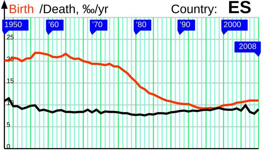 | Keywords: BirthDeath 1950 ES.svg en The birth and death rates in Spain 1950 2008 ru Π ΠΎΠΆΠ΄Π°Π΅ΠΌΠΎΡΡΡ ΠΈ ΡΠΌΠ΅Ρ ΡΠ½ΠΎΡΡΡ Π² ΠΡΠΏΠ°Π½ΠΈΠΈ 1950 2008 own Incnis Mrsi 2009-07-14 public domain File RNI 1950 ES svg Disclaimer The author of this graph gives no warranty and accepts no responsibility for its factual accuracy This graph is nothing but a visualization of data from http //demoscope ru/weekly/ias/ias05 php tim 0 cou 13 terr 1 ind 26 Submit OK http //demoscope ru/weekly/ias/ias05 php tim 0 cou 13 terr 1 ind 1 Submit OK which may be incomplete or error-prone If you find an error please correct the data in a <path d ¦ /> tag adding some comments about your reliable source and upload the file over Demographics of Spain Birth and death rates |