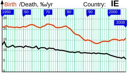 | Keywords: BirthDeath 1950 IE.svg en The birth and death rates in Ireland - Éire 1950 2008 ru Рождаемость и сме тность в И ландии госуда стве 1950 2008 own Incnis Mrsi 2009-07-13 public domain File RNI 1950 IE svg Disclaimer The author of this graph gives no warranty and accepts no responsibility for its factual accuracy This graph is nothing but a visualization of data from http //demoscope ru/weekly/ias/ias05 php tim 0 cou 12 terr 1 ind 26 Submit OK http //demoscope ru/weekly/ias/ias05 php tim 0 cou 12 terr 1 ind 1 Submit OK which may be incomplete or error-prone If you find an error please correct the data in a <path d /> tag adding some comments about your reliable source and upload the file over Temporal population graphs of Ireland Birth and death rates |