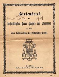 | Keywords: Bischof Charles Joseph Ruch, Straßburg, Hirtenbrief JS.jpg de Bischof Charles Joseph Ruch Strassburg Hirtenbrief 1919 own Joachim Specht 2009 eigener Scan vom eigenen alten Hirtenbrief 1919 1919 texts Pastoral letter Charles Joseph Eugène Ruch Coats of arms of bishops of the Roman Catholic Archdiocese of Strasbourg |