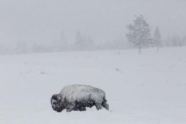 Keywords: bison buffalo snow winter cold wind american animal mammal prairie grassland yellowstone national park usa wyoming beast icon horns fur brown food meat healthy herd