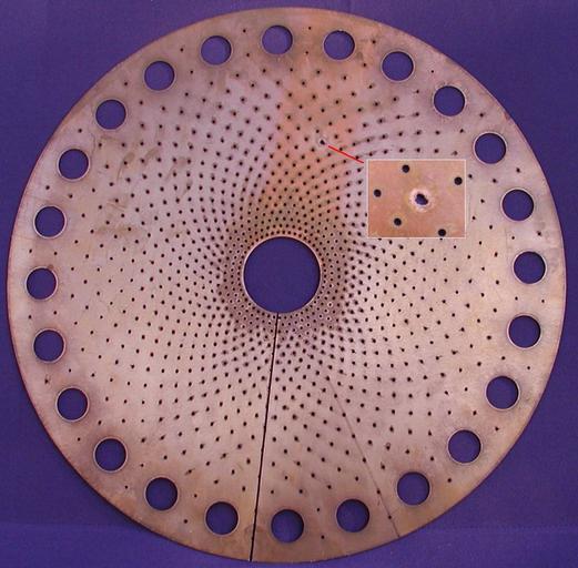 | Keywords: Bitter electromagnet disk.jpg Magnetscheibe aus einem 16-T-Magneten für 20 kA ca 40 cm Durchmesser mit Durchbrennstelle von einem Crash Copper conductor disk from a 16 T Bitter magnet a powerful electromagnet used in scientific research Diameter 40 cm Instead of wire windings Bitter magnets consist of a stack of split conductor disks like this separated by insulating spacers Electric current flows in a helical path through the stack of disks The conducting disks have the strength to withstand the enormous Lorentz forces caused by the magnetic field In operation this disk carries a current of 20 000 amperes Cooling water flows through the holes in the disk to carry away the enormous waste heat The magnetic field is created in the center hole This disk has been damaged by excessive heat shown in inset 2008-04-27 own PeterFrankfurt cc-zero Original upload log de wikipedia de wikipedia Magnetscheibe jpg 2008-04-27 16 57 PeterFrankfurt 1 058 × 1 040 399 Byte <nowiki> Information Magnetscheibe aus einem 20-T-Magneten für 20 kA ca 40 cm Durchmesser mit Durchbrennstelle von einem Crash selbst fotografiert ~~~ 27 April 2008 Andere Versionen Anmerkun</nowiki> Bitter electromagnets |
